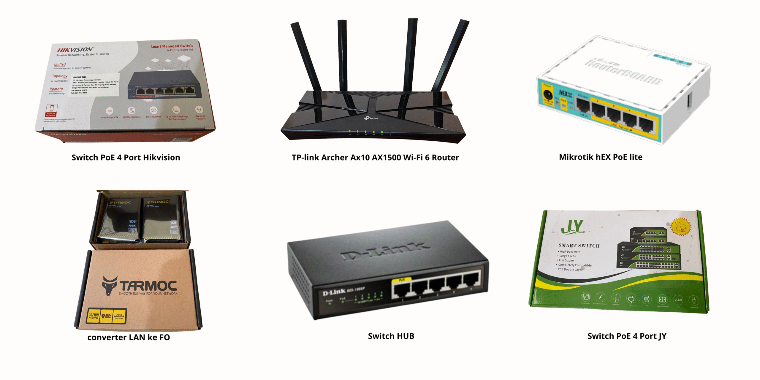 Menyediakan berbagai perlengkapan jaringan seperti switch hub, router, MikroTik, dan switch PoE untuk mendukung kebutuhan jaringan internet dan sistem komunikasi data. Cocok digunakan untuk rumah, kantor, sekolah, hingga lingkungan usaha, dengan pilihan perangkat yang andal, stabil, dan dapat disesuaikan dengan kebutuhan jaringan.